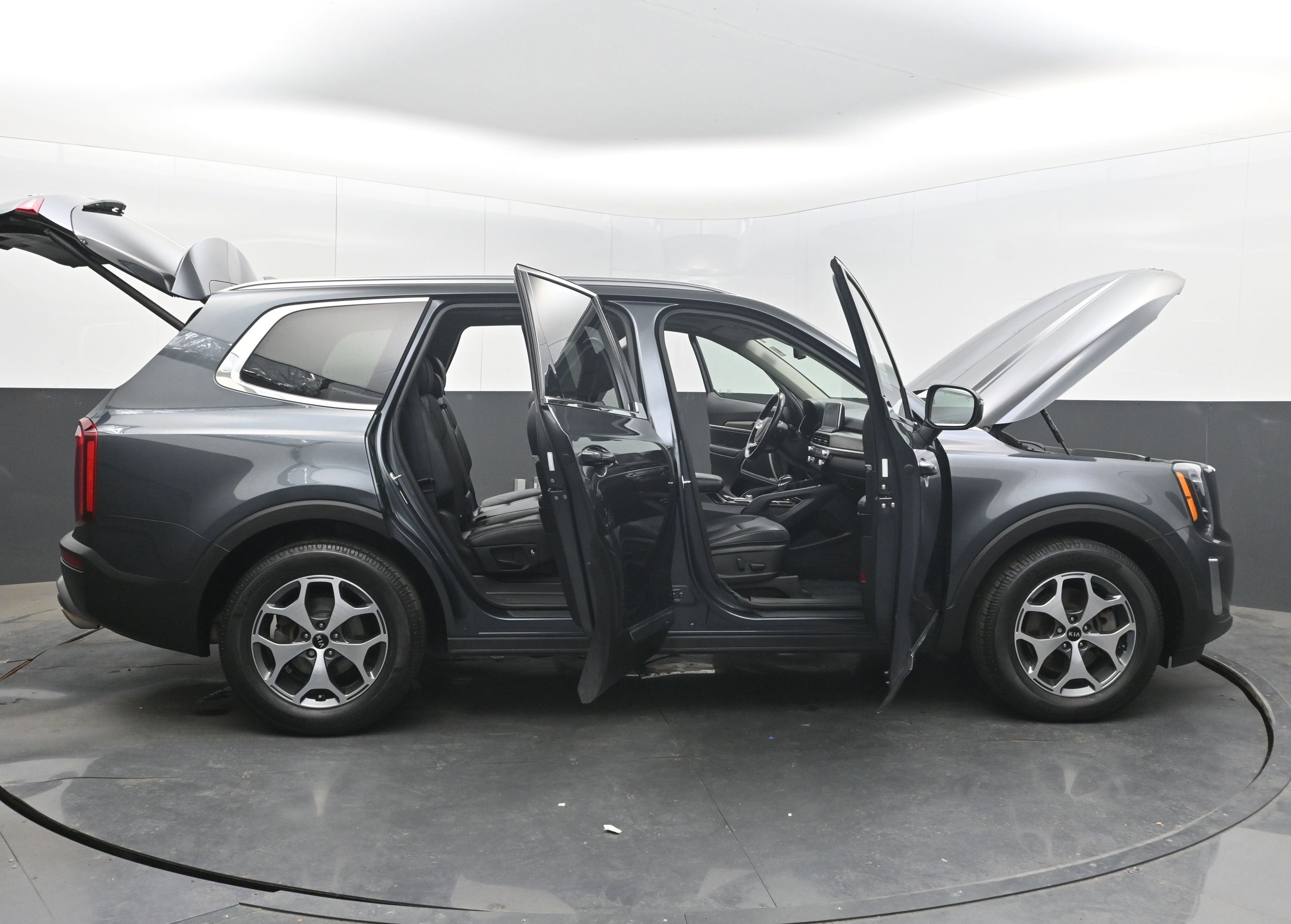 The 2020 Kia Telluride EX makes a bold statement with its stylish exterior design. The Gravity Gray metallic paint finish exudes sophistication, while the Aluminum Wheels add a touch of sporty flair. The Roof rails provide added versatility for carrying luggage or recreational equipment. The Automatic Headlights ensure optimal visibility in all conditions, while the LED daytime running lights enhance the vehicle's presence on the road. The Rear Spoiler adds a touch of aerodynamic style, while the overall design exudes confidence and capability.